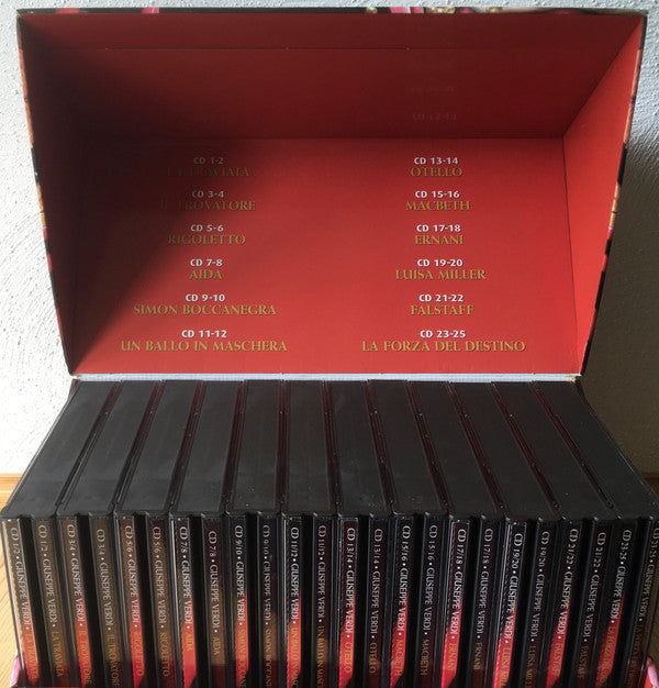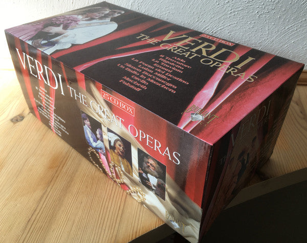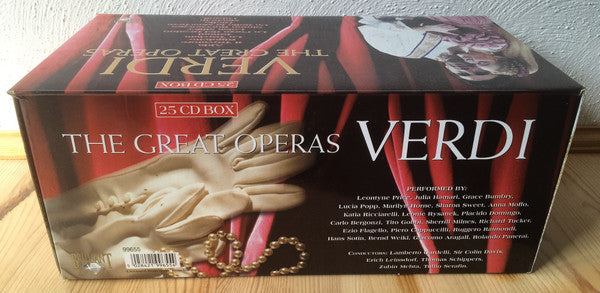 Big cardboard box holding twelve fat dual CD boxes; the first eleven contains two and the last one contains three discs. On the inside of the front cover of each box is a 2 pages "Story Of The Opera" (uncredited in English). At each disc and backside box: All tracks licensed from BMG The Netherlands. On backside cardboard box (beyond the barcode): Licensed from BMG, Benelux (= [l536222, which is its legal successor)