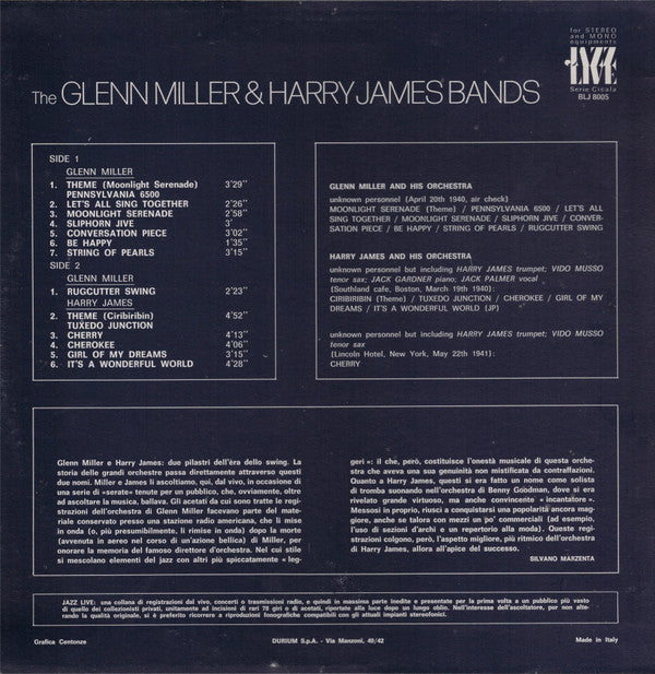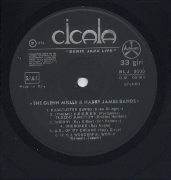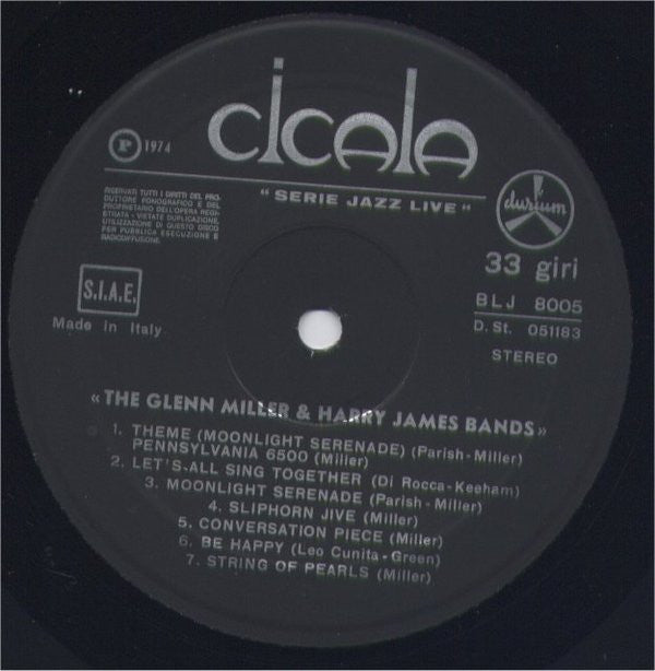 A1. Glenn Miller - Theme (Moonlight Serenade) Pennsylvania 6500 3:29 A2. Glenn Miller - Let's All Sing Together 2:26 A3. Glenn Miller - Moonlight Serenade 2:58 A4. Glenn Miller - Sliphorn Jive 3:00 A5. Glenn Miller - Conversation Piece 3:02 A6. Glenn Miller - Be Happy 1:35 A7. Glenn Miller - String Of Pearls 3:15 B1. Glenn Miller - Rugcutter Swing 2:23 B2. Harry James (2) - Theme (Ciribiribin) Tuxedo Junction 4:52 B3. Harry James (2) - Cherry 4:13 B4. Harry James (2) - Cherokee 4:06 B5. Harry James (2) - Girl Of My Dreams 3:15 B6. Harry James (2) - It's A Wonderful World 4:28