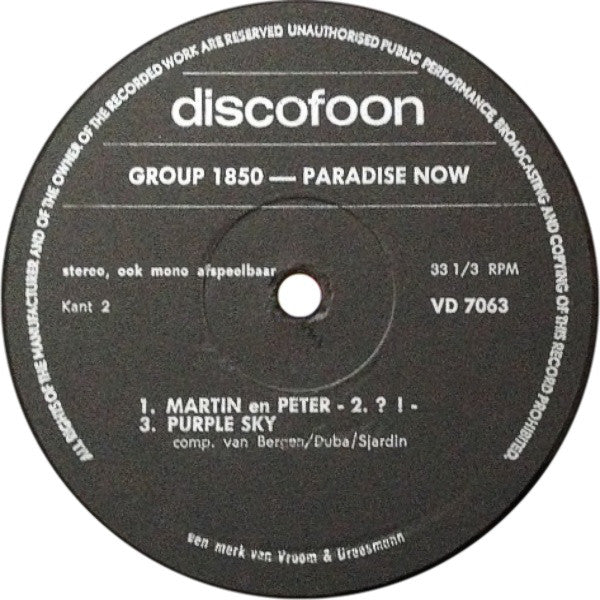 A1. Paradise Now A2. Friday I'm Free A3. Hunger A4. Circle A5. Lonelyness B1. Martin En Peter B2. ? ! B3. Purple Sky