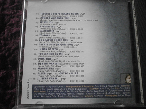 1. Iedereen Heeft Iemand Nodig 3:482. Zonder Woorden (You) 3:283. Ik Wil Jou 3:354. Vergeef Me 3:195. California 3:566. Zo Goed 3:127. 20 Garden Onder Nul 3:508. Geef Je Over (Major Tom) 4:229. Ik Ben Op Weg 3:5210. Tussen Jou En Mij 3:4811. Jong Zijn 4:3012. Jij Bent Van Mij (Accoustisch) 3:1213. Magdalena 3:4014. Alles 4:32. Alles 4:32. Bonustrack 16. Jij Bent Van Mij 3:25