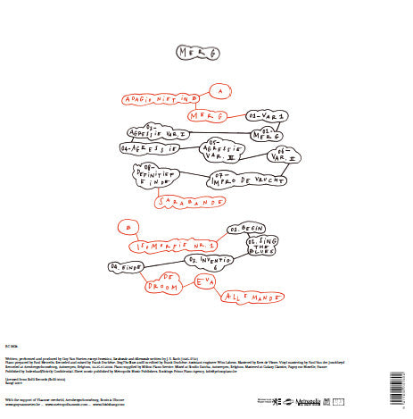 A1. Adagio Niet In B 3:08 A2. Merg 12:52 A2.1. Var. I 0:41 A2.2. Merg 1:45 A2.3. Agressie Var. I 1:40 A2.4. Agressie 1:43 A2.5. Agressie Var. II 1:34 A2.6. Var. II 1:03 A2.7. Impro De Vrucht 2:19 A2.8. Definitief Einde 2:04 A3. Sarabande 3:39 B1. Isomorfie Nr. 1 9:23 B1.1. Begin 0:22 B1.2. Sing The Blues 3:32 B1.3. Inventio 6 4:28 B1.4. Einde 1:01 B2. De Droom 4:25 B3. Eva 5:50 B4. Allemande 3:44