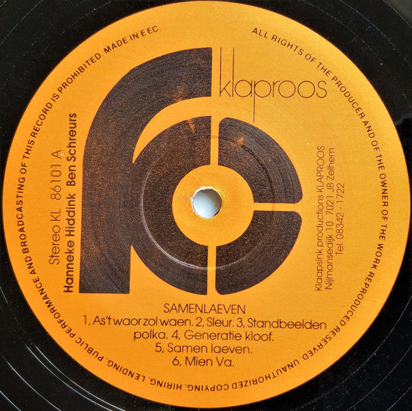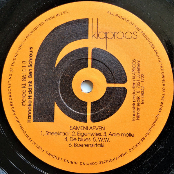 A1. As't Wao Zol Waen A2. Sleur A3. Standbeelden Polka A4. Generatie Kloof A5. Samen Laeven A6. Mien Va B1. Streektaal B2. Eigenwies B3. Aole Mölle B4. De Blues B5. W.W. B6. Boerensirtaki