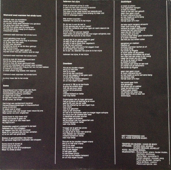 A1. Kom Naar Huis 4:07 A2. Heel Even 2:54 A3. Een Vrouw Zoals Jij 3:30 A4. Samen Zijn 3:21 A5. St. Mère Église 2:39 A6. Sammy 1:56 B1. Niemand Weet Wanneer Het Einde Komt 3:11 B2. Soms 3:09 B3. Iedereen Het Zijne 3:35 B4. Overdoen 3:38 B5. Dominique 3:44