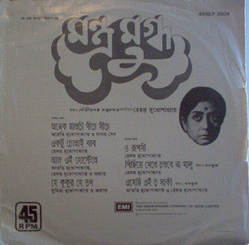Track titles printed in Bengali text on album sleeve and record label. Artist names and credits printed in Bengali text on album sleeve and in English text on record label. Roman-transliterated track titles: