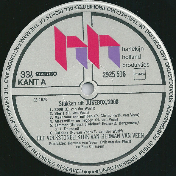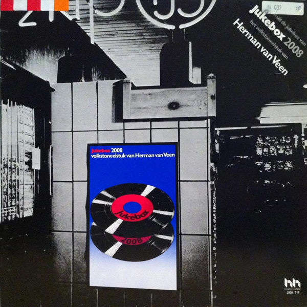 "Stukken uit de jukebox van Jukebox 2008 het volkstoneelstuk van Herman van Veen" Een Harlekijn-Toneel Muziekplaat: Deze plaat wordt gedraaid in de jukebox tijdens de voorstelling van Jukebox 2008 Opname: M.C. Studio, Nederhorst den Berg Some copies come with a sticker: "met drie nieuwe nummers van Herman van Veen" Track A5 on sleeve only credited to Tolchard Evans.