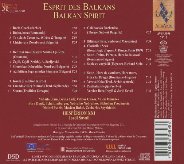 1. Borin Cocek (Serbie) 3:502. Doina, Hora (Roumanie) 5:283. Ta Xyla & Çeçen Kızı (Grèce & Turquie) 2:594. Chichovata (Bulgarie) 3:355. Der Makām-ı Hüseynī Sakīl-i Ağa Rıżā (Turquie) 3:316. Zajdi, Zajdi (Serbie) 5:227. Sborenka (Dobrudzha, Nord-est Bulgarie) 2:298. Azt Hittem Hogy Minden Könnyem (Tsigane) 5:289. Kovni (Tradition Kurde) 3:0510. Cuando El Rey Nimrod (Séfarade) 3:5011. Sousta (Grèce) 3:2012. Galabovska Ruchenitsa (Thrace, Sud-est Bulgarie) 4:2713. Bilijana (Pirin, Sud-ouest Macédoine) 4:3814. Ciocârlia / Seva. Bora Dugić D’après Angheluş Dinicu, Paris 1889 2:2115. Suite - Doina, Purtata, Hora Ka la Kaval (Roumanie-Tsigane) 7:4816. Sanie Cu Zurgălăi (Tsigane) 2:1117. Suite - Hora de Ascultare, Hora Mare, Hora Lui Dragoi (Roumanie-Tsigane) 7:1018. Vrcavo Kolo (Tradition de Serbie Centrale) 2:3219. Pastirska Elegija (Serbie). Version Musicale Bora Dugić Et Jordi Savall 3:41