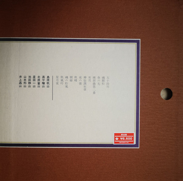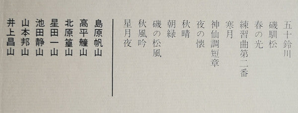 A1. 井上昌山, 高平艟山 - 五十鈴川 A2. Kôzan Kitahara II, Seizan Ikeda II - 磯馴松 B1. 島原帆山, Hozan Yamamoto - 春の光 B2. 高平艟山, Ichizan Hoshida II - 練習曲第二番 C1. Ichizan Hoshida II, 島原帆山, Kôzan Kitahara II - 寒月 C2. Ichizan Hoshida II - 神仙調短章 D1. Kôzan Kitahara II - 夜の懐 D2. Ichizan Hoshida II, 高平艟山 - 秋晴 E1. 井上昌山, Hozan Yamamoto - 朝緑 E2. Hozan Yamamoto, Seizan Ikeda II - 磯の松風 F1. Seizan Ikeda II - 秋風吟 F2. Seizan Ikeda II, Hozan Yamamoto, 井上昌山 - 星月夜