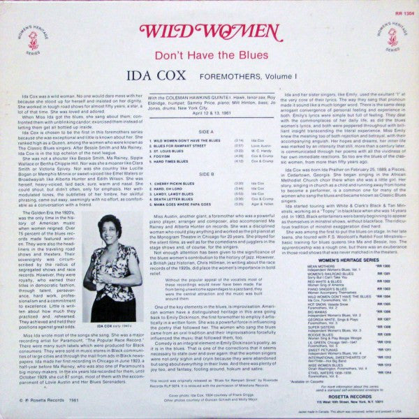 A1. Wild Women Don't Have The Blues 3:14 A2. Blues For Rampart Street 2:57 A3. St. Louis Blues 3:22 A4. Fogyism 4:28 A5. Hard Time Blues 4:12 B1. Cherry Pickin Blues 3:30 B2. Hard, Oh Lord 3:44 B3. Lawdy, Lawdy Blues 5:53 B4. Death Letter Blues 3:36 B5. Mama Goes Where Papa Goes 3:25