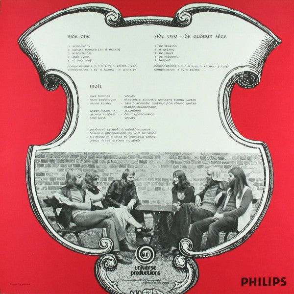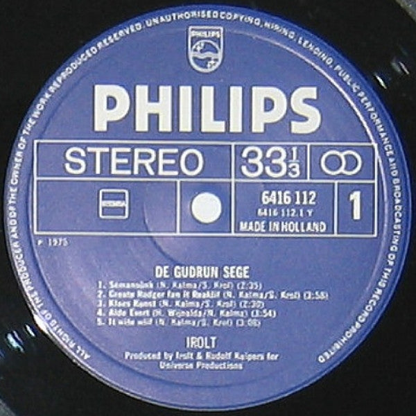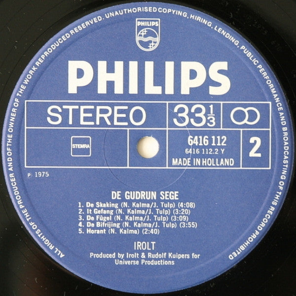 ''All music published by Universal Songs. Lyrics in translation included.'' Including a newspaper insert with lyrics in Frisian. Also a description on the lyrical themes in Dutch. This is a reissue of the Universe Release of '75. On the back on the sleeve there is still the Universe production logo. Side B is credited as a work titled "De Gudrun Sêge" on the rear cover, but not on the labels.