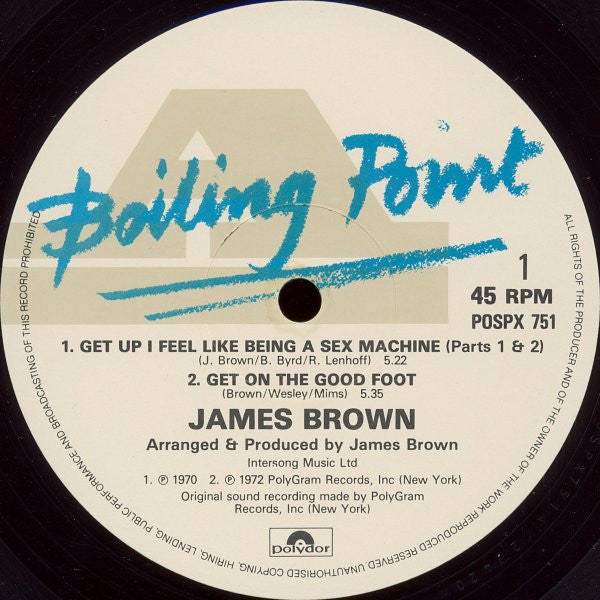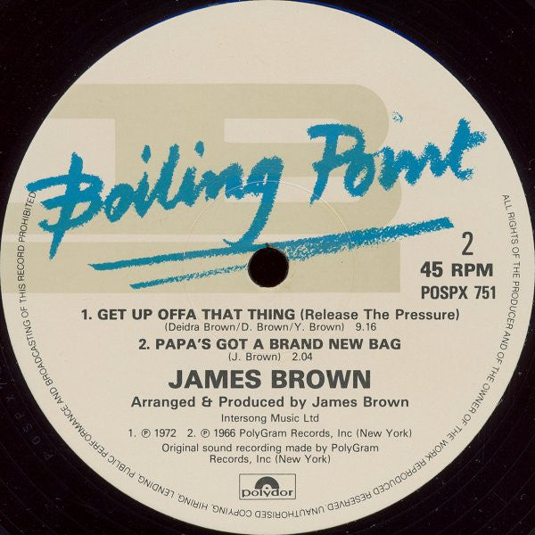 A1. James Brown, The J.B.'s - Get Up I Feel Like Being A Sex Machine (Part 1 & 2) 5:22 A2. James Brown, The J.B.'s - Get On The Good Foot 5:35 B1. James Brown, The J.B.'s - Get Up Offa That Thing (Release The Pressure) 9:16 B2. James Brown - Papa's Got A Brand New Bag 2:04