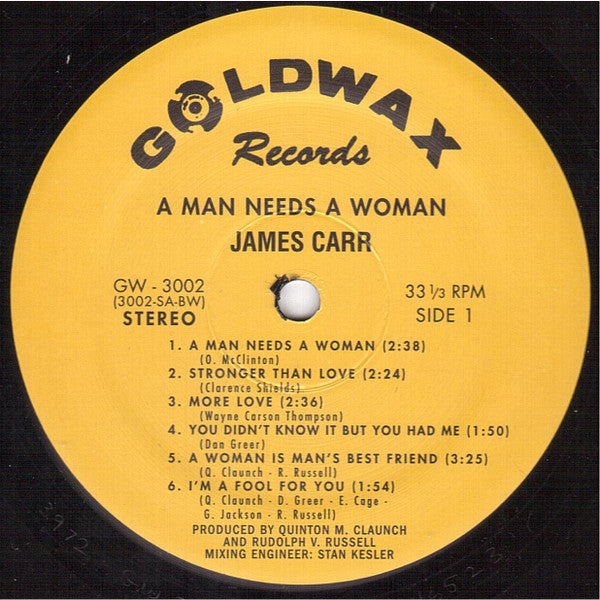 A1. A Man Needs A Woman 2:38 A2. Stronger Than Love 2:24 A3. More Love 2:36 A4. You Didn't Know It But You Had Me 1:50 A5. A Woman Is A Man's Best Friend 3:25 A6. I'm A Fool For You 1:54 B1. Life Turned Her That Way 2:29 B2. Gonna Send You Back To Georgia 2:10 B3. The Dark End Of The Street 2:20 B4. Sowed Love And Reaped A Heartache 2:20 B5. You've Got My Mind Messed Up 2:20