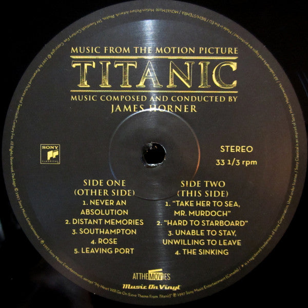 A1. Never An Absolution 3:03 A2. Distant Memories 2:24 A3. Southampton 4:02 A4. Rose 2:52 A5. Leaving Port 3:26 B1. "Take Her To Sea, Mr. Murdoch" 4:31 B2. "Hard To Starboard" 6:52 B3. Unable To Stay, Unwilling To Leave 3:57 B4. The Sinking 5:05 C1. Death Of Titanic 8:26 C2. A Promise Kept 6:03 C3. A Life So Changed 2:13 D1. An Ocean Of Memories 7:58 D2. My Heart Will Go On (Love Theme From Titanic) 5:15 D3. Hymn To The Sea 6:26