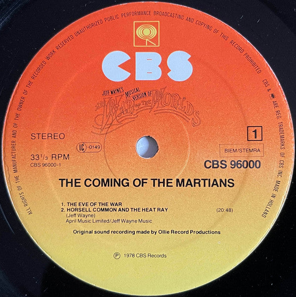 Rear sleeve cover shows: - Label code bottom right - Price codes top right - ''℗ 1978 CBS Records/© 1978 CBS Records...''. bottom centre All four labels show: - Label code - Total track time only for each side - ''Original sound recording made by Ollie Record Productions'' - Rights Societies - ''℗ 1978 CBS Records'' Published by April Music Limited/Jeff Wayne Music, except B.2, Leeds Music Limited/Jeff Wayne Music. The bottom of the cover's inner gatefold states: HORSELL COMMON "The chances of anything coming from Mars are a million to one," he said. Painting by Peter Goodfellow --- Additional info: - Made & Printed in Holland. - Interpak II by Shorewood Packaging. Includes a 16 page booklet with illustrations and artist info. This version is physically identical to these other European issues: [r=653070 and [r=11969955 The difference is in the runouts: this release does not have identifiers for Denis Blackham in the runout.