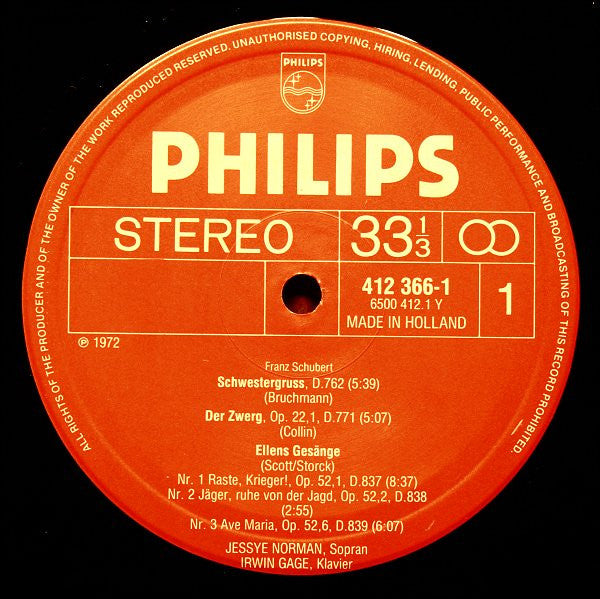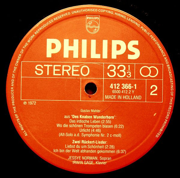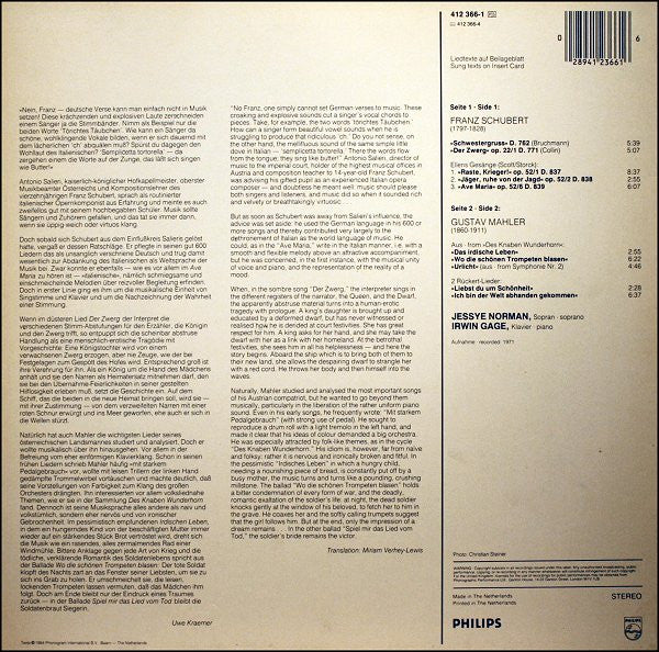 A1. "Schwestergruss", D. 762 (Bruchmann) 5:39 A2. "Der Zwerg", Op. 22/1, D. 771 (Collin) 5:07 . Ellens Gesänge (Scott/Storck) A3. 1. "Raste, Krieger!", Op. 52/1, D.837 8:37 A4. 2. "Jäger, Ruhe Von Der Jagd", Op. 52/2, D.838 2:55 A5. 3. "Ave Maria", Op. 52/6, D.839 6:07 . Aus: "Des Knaben Wunderhorn" B1. "Das Irdische Leben" 2:55 B2. "Wo Der Schönen Trompeten Blasen" 6:22 B3. "Urlicht" (Alt-solo Aus Dem Symphonie Nr. 2, C-moll) 4:46 . 2 Rückert-Lieder B4. "Liebst Du Um Schönheit" 2:28 B5. "Ich Bin Der Welt Abhanden Gekommen" 6:37