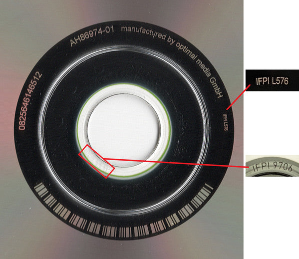 Barcode 0 825646 146512Label Code LC 30419Rights Society GEMA-MCPSMatrix / Runout 0825646146512 AH86974-01 manufactured by optimal media GmbH Mastering SID Code IFPI L577Mould SID Code IFPI 9721Matrix / Runout 0825646146512 AH86974-01 manufactured by optimal media GmbH Mastering SID Code IFPI L578Mould SID Code IFPI 9718Matrix / Runout 0825646146512 AH86974-01 manufactured by optimal media GmbHMastering SID Code IFPI L578Mould SID Code IFPI 9702Matrix / Runout 0825646146512 AH86974-01 manufactured by optimal media GmbHMastering SID Code IFPI L578Mould SID Code IFPI 9707Matrix / Runout 0825646146512 AH86974-01 manufactured by optimal media GmbHMastering SID Code IFPI L577Mould SID Code IFPI 9702Matrix / Runout 0825646146512 AH86974-01 manufactured by optimal media GmbHMastering SID Code IFPI L578Mould SID Code IFPI 9703Matrix / Runout 0825646146512 AH86974-01 manufactured by optimal media GmbHMastering SID Code IFPI L576Mould SID Code IFPI 9706