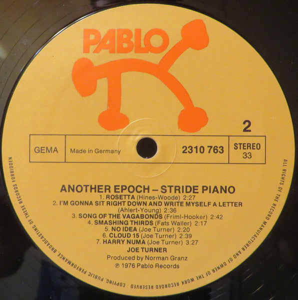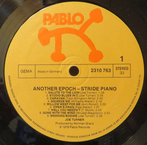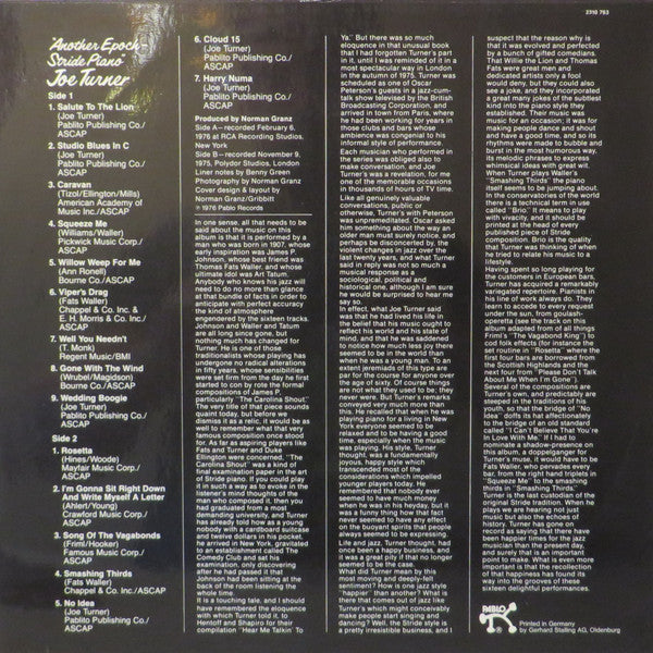 A1. Salute To The Lion 1:28 A2. Studio Blues In C 2:26 A3. Caravan 3:46 A4. Squeeze Me 2:18 A5. Willow Weep For Me 3:09 A6. Viper's Drag 1:57 A7. Well You Needn't 2:03 A8. Gone With The Wind 2:02 A9. Wedding Boogie 2:39 B1. Rosetta 2:27 B2. I'm Gonna Sit Right Down And Write Myself A Letter 2:36 B3. Song Of The Vagabonds 2:42 B4. Smashing Thirds 2:17 B5. No Idea 2:20 B6. Cloud 15 2:39 B7. Harry Numa 3:27