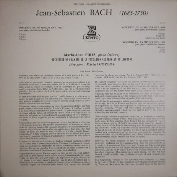 . Concerto En Re Mineur BWV 1052 Pour Piano Et Orchestre A Cordes . Concerto En La Majeur BWV 1055 Pour Piano Et Orchestre A Cordes . Concerto En Fa Mineur BWV 1056 Pour Piano Et Orchestre A Cordes