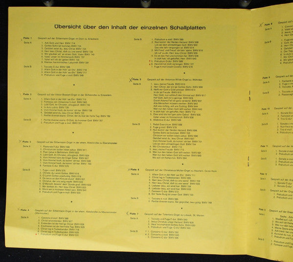 A,B - Gespielt auf der Silbermann-Orgel im Dom zu Arlesheim C,D - Gespielt auf der Viktor-Bossart-Orgel in der Stiftskirche zu Einsiedeln E,F - Gespielt auf der Silbermann-Orgel in der ehem. Abteikirche zu Ebersmünster G,H - Gespielt auf der Silbermann-Orgel in der ehem. Abteikirche zu Maursmünster I,J - Gespielt auf der Antonius-Wilde-Orgel zu Wöhrden K,L - Gespielt auf der Christianus-Müller-Orgel zu Haarlem, Grote Kerk M,N - Gespielt auf der Totentanz-Orgel zu Lübeck, St. Marien O,P - Gespielt auf der Johan-Niclas-Cahman-Orgel zu Leufstabruk Q,R - Gespielt auf der Frobenius-Orgel der Krist Kirke zu Tondern S,T - Gespielt auf der Jacob-Scherer-Orgel zu Mölln U,V - Gespielt auf der Arp-Schnitger-Orgel zu Norden, St. Ludgeri W,X - Gespielt auf der Arp-Schnitger-Orgel zu Neuenfelde, St. Pankratius Y,Z - Gespielt auf der Erasmus-Bielfeldt-Orgel zu Stade, St. Wilhadi AA,BB,CC,DD - Gespielt auf den Orgeln von Karl Joseph Riepp in der Basilika zu Ottobeuren EE,FF - Gespielt auf der Joseph-Gabler-Orgel der Basilika zu Weingarten GG,HH - Gespielt auf der Hillebrand-Orgel zu Bremervörde, St. Liborius II,JJ - Gespielt auf der Stumm-Orgel, der ehem. Abteikirche zu Amorbach