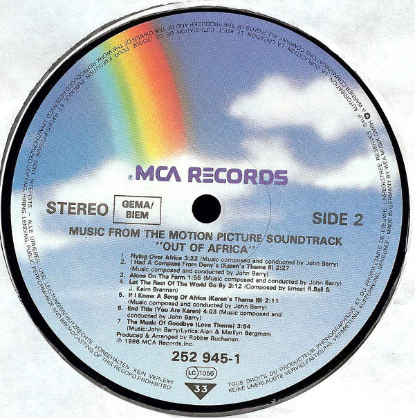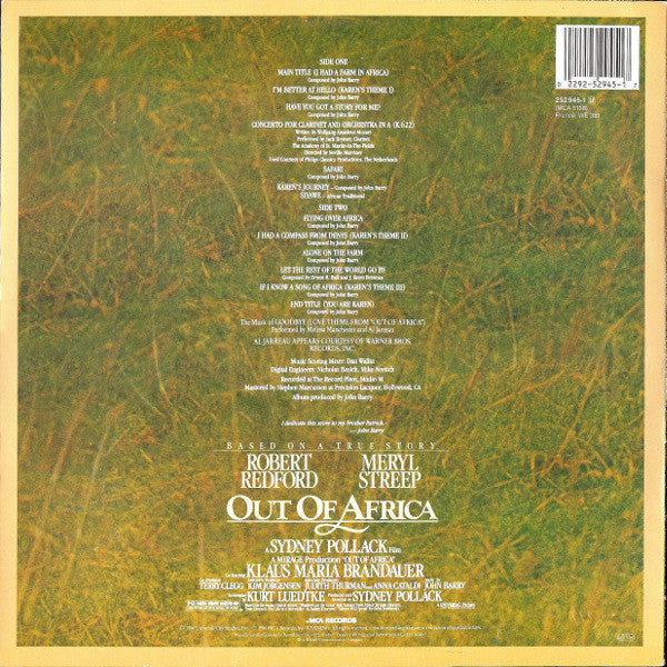 A1. Main Title (I Had A Farm In Africa) 3:07 A2. I'm Better At Hello (Karen's Theme I) 1:15 A3. Have You Got A Story For Me? 1:12 A4. Concerto For Clarinet And Orchestra In A (K.622) 2:46 A5. Safari 2:40 A6. Karen's Journey / Siyawe 4:46 B1. Flying Over Africa 3:22 B2. I Had A Compass From Denys (Karen's Theme II) 2:27 B3. Alone On The Farm 1:55 B4. Let The Rest Of The World Go By 3:12 B5. If I Know A Song Of Africa (Karen's Theme III) 2:11 B6. End Title (You Are Karen) 4:03 B7. The Music Of Goodbye (Love Theme) 3:54