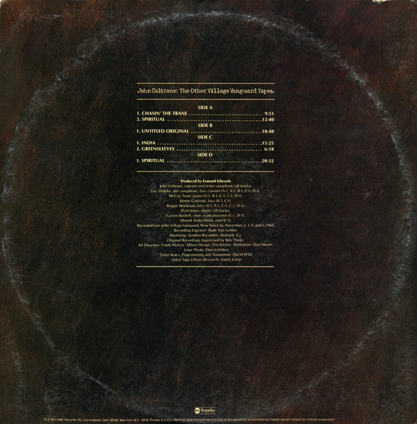 A1. Chasin' The Trane 9:51 A2. Spiritual 12:40 B. Untitled Original 18:40 C1. India 15:25 C2. Greensleeves 6:18 D. Spiritual 20:32