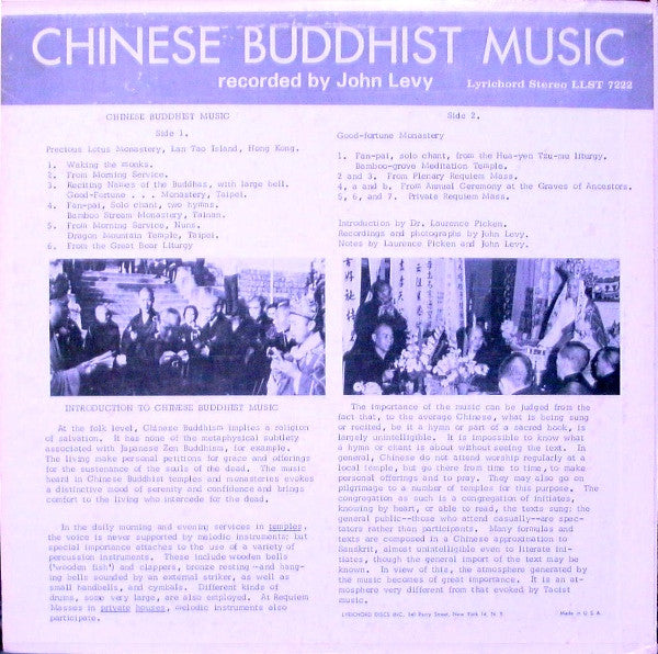 A1. Waking The Monks A2. Morning Service A3. Recitation With Large Bell A4. Solo Melodic Chant A5. Morning Service, Nuns A6. Pei-tou Liturgy (Great Bear Liturgy) B1. Hua-yen Tzu-mu Liturgy (Solo Chant) B2. Shu-lu Fa-hux (Plenary Requiem Mass) B3. Shu-lu Fa-hux (Plenary Requiem Mass) B4. Ch'ing-ming (Ceremony At Graves Of Ancestors) B5. Ch'ao-tu Wang-hun (Private Requiem Mass) B6. Ch'ao-tu Wang-hun (Private Requiem Mass) B7. Ch'ao-tu Wang-hun (Private Requiem Mass)