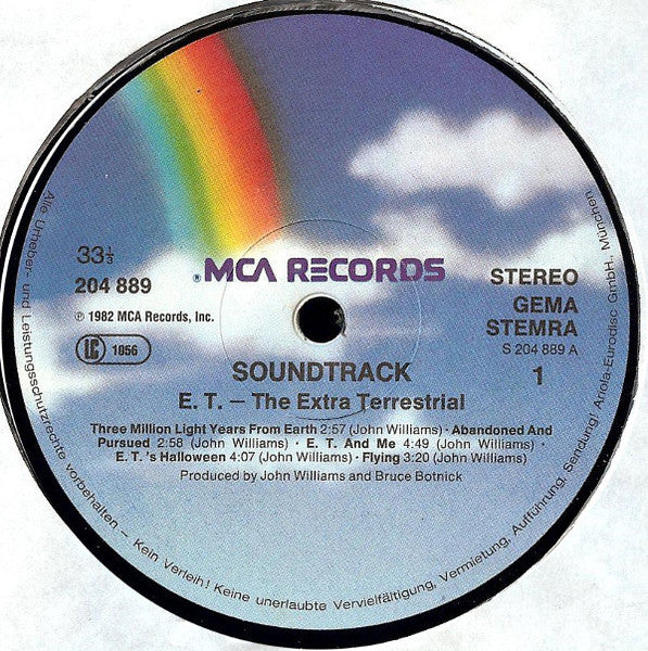 A1. Three Million Light Years From Earth 2:57 A2. Abandoned And Pursued 2:58 A3. E.T. And Me 4:49 A4. E.T.'s Halloween 4:07 A5. Flying 3:20 B1. E.T. Phone Home 4:18 B2. Over The Moon 2:06 B3. Adventure On Earth 15:06