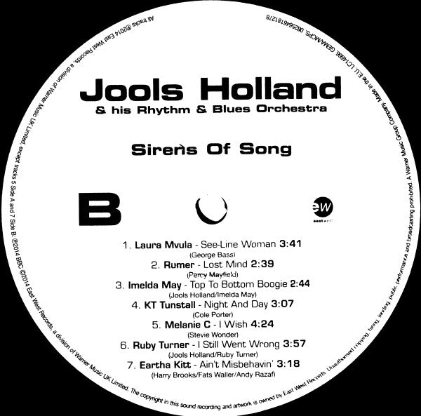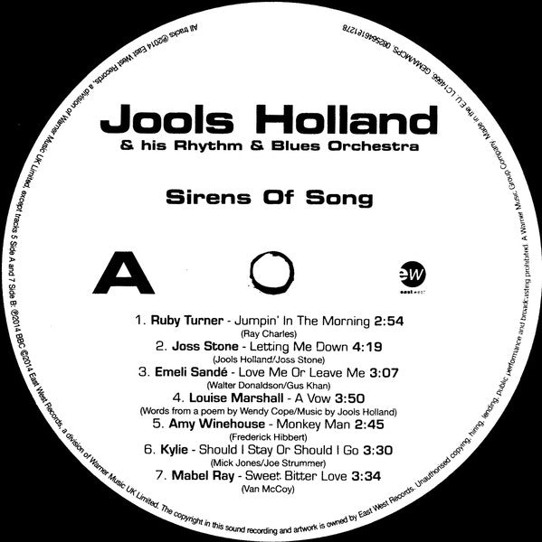 A1. Jools Holland, Ruby Turner - Jumping In The Morning 2:54 A2. Jools Holland, Joss Stone - Letting Me Down 4:19 A3. Jools Holland, Emeli Sandé - Love Me Or Leave Me 3:07 A4. Jools Holland, Louise Clare Marshall - A Vow 3:50 A5. Jools Holland, Amy Winehouse - Monkey Man 2:45 A6. Jools Holland, Kylie Minogue - Should I Stay Or Should I Go 3:34 A7. Jools Holland, Mabel Ray - Sweet Bitter Love 3:34 B1. Jools Holland, Laura Mvula - See-Line Woman 3:41 B2. Jools Holland, Rumer - Lost Mind 2:39 B3. Jools Holland, Imelda May - Top To Bottom Boogie 2:44 B4. Jools Holland, KT Tunstall - Night And Day 3:07 B5. Jools Holland, Melanie C - I Wish 4:24 B6. Jools Holland, Ruby Turner - I Still Went Wrong 3:57 B7. Jools Holland, Eartha Kitt - Ain't Misbehavin' 3:18