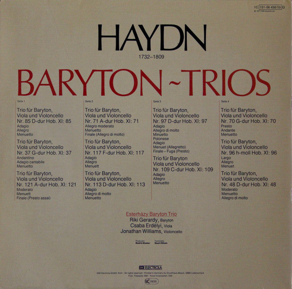 A1. Trio Für Baryton,Viola Und Violoncello Nr.85 D-Dur Hob. XI:85 A2. Trio Für Baryton,Viola Und Violoncello Nr.37 G-Dur Hob. XI:37 A3. Trio Für Baryton,Viola Und Violoncello Nr.121 Hob. XI:121 B1. Trio Für Baryton,Viola Und Violoncello Nr.71 A-Dur Hob. XI:71 B2. Trio Für Baryton,Viola Und Violoncello Nr.117 F-Dur Hob. XI:117 B3. Trio Für Baryton,Viola Und Violoncello Nr.113 D-Dur Hob. XI:113 C1. Trio Für Baryton,Viola Und Violoncello Nr.97 D-Dur Hob. XI:97 C2. Trio Für Baryton,Viola Und Violoncello Nr.109 C-Dur Hob. XI:109 D1. Trio Für Baryton,Viola Und Violoncello Nr.70 G-Dur Hob. XI:70 D2. Trio Für Baryton,Viola Und Violoncello Nr.96 H-Moll Hob. XI:96 D3. Trio Für Baryton,Viola Und Violoncello Nr.48 D-Dur Hob. XI:48
