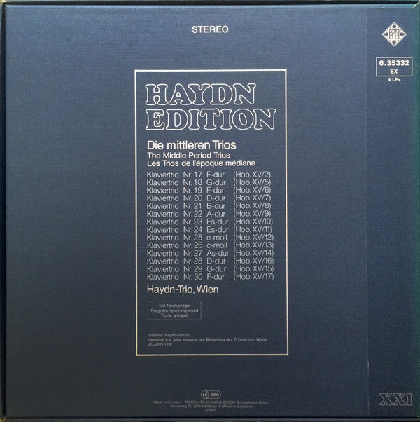 . Klaviertrio Nr.17 F-dur Hob. Xv:2 . Klaviertrio Nr.18 G-dur Hob. Xv:5 . Klaviertrio Nr.19 F-dur Hob. Xv:6 . Klaviertrio Nr.20 D-dur Hob. Xv:7 . Klaviertrio Nr.21 B-dur Hob. Xv:8 . Klaviertrio Nr.22 A-dur Hob. Xv:9 . Klaviertrio Nr.23 Es-dur Hob. Xv:10 . Klaviertrio Nr.24 Es-dur Hob. Xv:11 . Klaviertrio Nr.25 E-moll Hob. Xv:12 . Klaviertrio Nr.26 C-moll Hob. Xv:13 . Klaviertrio Nr.27 As-dur Hob. Xv:14 . Trio Für Flöte, Violoncello Und Klavier Nr.28 D-dur Hob Xv:16 . Trio Für Flöte, Violoncello Und Klavier Nr.29 G-dur Hob Xv:15 . Trio Für Flöte, Violoncello Und Klavier Nr.30 F-dur Hob Xv:17