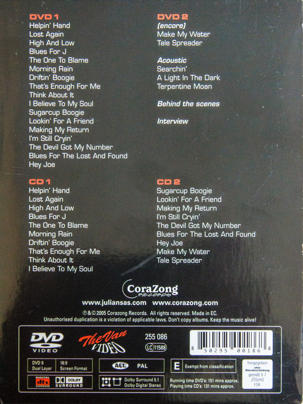 . DVD 1 DVD 1-1. Helpin' Hand DVD 1-2. Lost Again DVD 1-3. High And Low DVD 1-4. Blues For J DVD 1-5. The One To Blame DVD 1-6. Morning Rain DVD 1-7. Driftin' Boogie DVD 1-8. That's Enough For Me DVD 1-9. Think About It DVD 1-10. I Believe To My Soul DVD 1-11. Sugarcup Boogie DVD 1-12. Lookin' For A Friend DVD 1-13. Making My Return DVD 1-14. I'm Still Cryin' DVD 1-15. The Devil Got My Number DVD 1-16. Blues For The Lost And Found DVD 1-17. Hey Joe . DVD 2 DVD 2-1. Make My Water (Encore) DVD 2-2. Tale Spreader (Encore) DVD 2-3. Searchin' (Acoustic) DVD 2-4. A Light In The Dark (Acoustic) DVD 2-5. Terpentine Moan (Acoustic) DVD 2-6. Behind The Scenes DVD 2-7. Interview . CD 1 CD 1-1. Helpin' Hand CD 1-2. Lost Again CD 1-3. High And Low CD 1-4. Blues For J CD 1-5. The One To Blame CD 1-6. Morning Rain CD 1-7. Driftin' Boogie CD 1-8. That's Enough For Me CD 1-9. Think About It CD 1-10. I Believe To My Soul . CD 2 CD 2-1. Sugarcup Boogie CD 2-2. Lookin' For A Friend CD 2-3. Making My Return CD 2-4. I'm Still Cryin' CD 2-5. The Devil Got My Number CD 2-6. Blues For The Lost And Found CD 2-7. Hey Joe CD 2-8. Make My Water CD 2-9. Tale Spreader