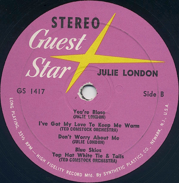A1. Julie London - Foggy Day A2. The Ted Comstock Orchestra - Cheek To Cheek A3. Julie London - Sometimes I Feel Like A Motherless Child A4. The Ted Comstock Orchestra - I've Got The Sun In The Morning A5. The Ted Comstock Orchestra - How Deep Is The Ocean B1. Julie London - You're Blase B2. The Ted Comstock Orchestra - I've Got My Love To Keep Me Warm B3. Julie London - Don't Worry About Me B4. The Ted Comstock Orchestra - Blue Skies B5. The Ted Comstock Orchestra - Top Hat White Tie & Tails