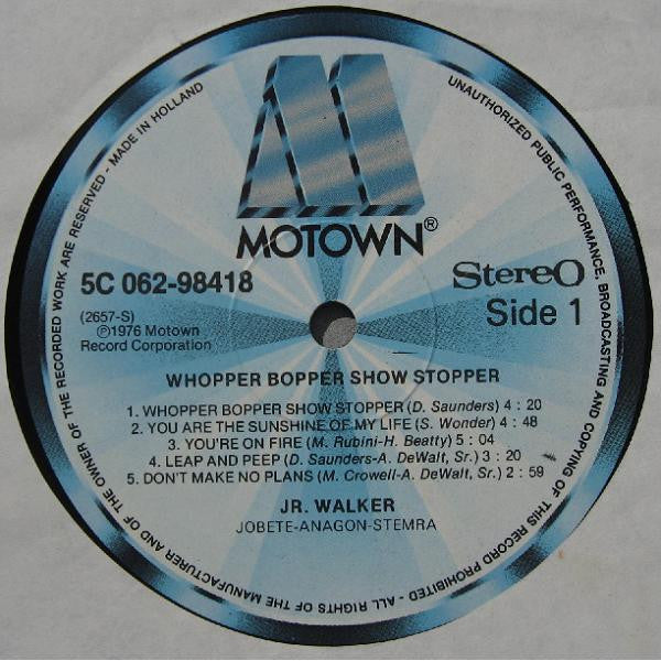 A1. Whopper Bopper Show Stopper 4:20 A2. You Are The Sunshine Of My Life 4:48 A3. You're On Fire 5:04 A4. Leap And Peep 3:20 A5. Don't Make No Plans 2:59 B1. I Could Never Love Another (After Loving You) 3:22 B2. I Want You 4:05 B3. Love Ain't Enough 5:38 B4. My Love 5:25