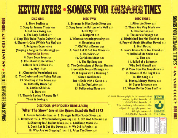 1-1. Town Feeling 4:511-2. Song For Insane Times 4:011-3. Girl On A Swing 2:491-4. The Lady Rachel 5:171-5. Stop This Train (Again Doing It) 6:051-6. Eleanor's Cake (Which Ate Her) 2:531-7. Religious Experience (Singing A Song In The Morning) 4:441-8. Soon Soon Soon 3:201-9. Rheinhardt & Geraldine / Colores Para Delores 5:381-10. May I? 3:591-11. Clarence In Wonderland 2:061-12. The Oyster And The Flying Fish 2:371-13. Shooting At The Moon 5:471-14. Butterfly Dance 3:431-15. Gemini Child 3:141-16. Stars 3:301-17. There Is Loving / Among Us / There Is Loving 7:212-1. Stranger In Blue Suede Shoes 3:192-2. Song From The Bottom Of A Well 4:352-3. Oh My 2:572-4. Margaret 3:172-5. Whatevershebringswesing 8:102-6. Decadence 8:042-7. Oh! Wot A Dream 2:482-8. Don't Let It Get You Down 3:582-9. Interview 4:432-10. Caribbean Moon 3:012-11. The Up Song 3:152-12. The Confessions Of Doctor Dream: Irreversible Neural Damage 6:432-13. It Begins With A Blessing / Once I Awakened / But It Ends With A Curse 8:162-14. See You Later 4:382-15. Ballbearing Blues 0:553-1. After The Show 2:353-2. Thank You Very Much 3:003-3. Obervations 4:213-4. Toujours La Voyage 7:573-5. Diminished But Not Finished 1:553-6. Farewell Again (Another Dawn) 3:133-7. Yes I Do 3:123-8. Love's Gonna Turn You Round 4:513-9. Ballad Of Mr. Snake 2:063-10. Blue 6:263-11. Ballad Of A Salesman Who Sold Himself 4:313-12. A View From The Mountain 6:163-13. Beware Of The Dog II 5:583-14. Hat Song 1:143-15. Money, Money, Money 3:113-16. Super Salesman 5:033-17. Where Do The Stars End? 3:014-1. Banana Introduction 3:084-2. Stranger In Blue Suede Shoes 3:574-3. Interview 7:504-4. Whatevershebringswesing 7:234-5. Oh! Wot A Dream 3:474-6. Shouting In A Bucket Blues 5:164-7. Caribbean Moon 3:344-8. Don't Let It Get You Down 4:464-9. We Did It Again 11:234-10. Why Are We Sleeping? 16:054-11. After The Show 3:30