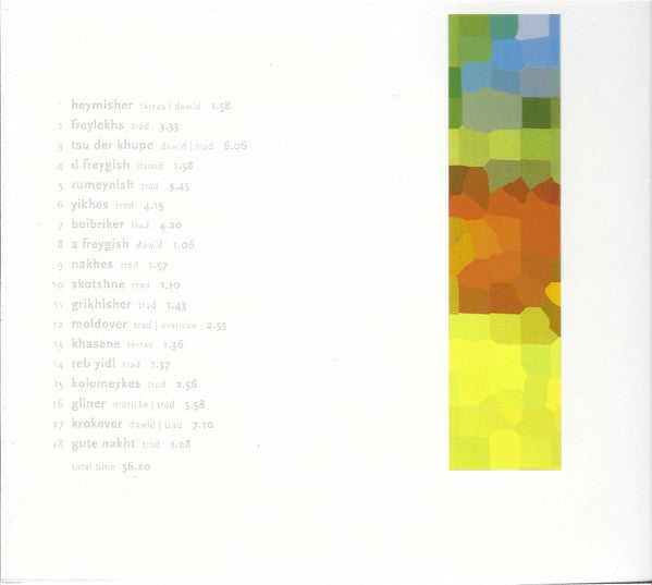 1. Heymisher 1:582. Freylekhs 3:333. Tsu Der Khupe 6:064. D Freygish 1:585. Rumeynish 3:456. Yikhes 4:157. Boibriker 4:208. A Freygish 1:069. Nakhes 1:5710. Skotshne 1:1011. Grkhisher 1:4312. Moldover 2:5513. Khasene 1:3614. Reb Yidl 1:3715. Kolomeykes 2:5616. Gliner 5:5817. Krokever 7:1018. Gute Nakht 1:28