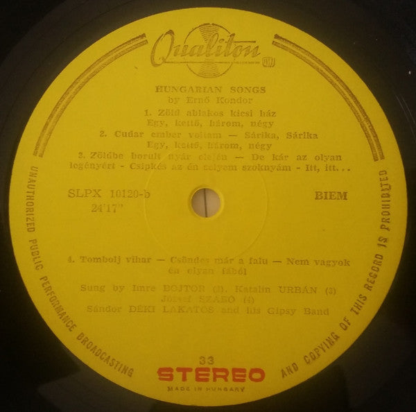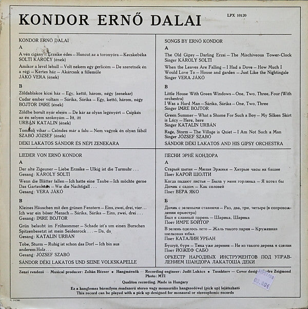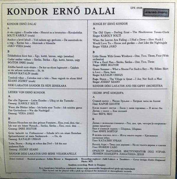 A1a. A Vén Cigány = The Old Gipsy A1b. Erzsike Édes = Darling Erzsi A1c. Huncut Az A Toronyóra = The Mischiveous Tower-Clock A1d. Kecskebéka A2a. Amikor A Levél Lehull = When The Leaves Are Falling A2b. Volt Nekem Egy Gerlicém = I Had A Dove A2c. De Szeretnék Én A Régi... = How Much I Would Love To A2d. Kertes Ház = House And Garden A2e. Akárcsak A Fülemüle = Just Like The Nightingale B1a. Zöldablakos Kicsi Ház = Little House With Green Windows B1b. Egy, Kettő, Három, Négy (Zenekar) = One, Two, Three, Four (With Orchestra) B2a. Cudar Ember Voltam = I Was A Hard Man B2b. Sárika, Sárika B2c. Egy, Kettő, Három, Négy = One, Two, Three B3a. Zöldbe Borult Nyár Elején = Green Summer B3b. De Kár Az Olyan Legényért = What A Shame For Such A Boy B3c. Csipkés Az Én Selyem Szoknyám = My Silken Shirt Is Lacy B3d. Itt, Itt... = Here, Here B4a. Tombolj Vihar = Rage, Storm B4b. Csöndes Már A Falu = The Village Is Quiet B4c. Nem Vagyok Én Olyan Fából = I Am Not Such A Man