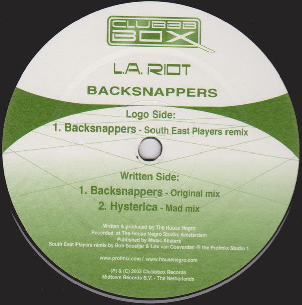 A. Backsnappers (South East Players Remix) B1. Backsnappers (Original Mix) B2. Hysterica (Mad Mix)