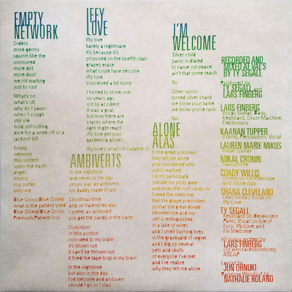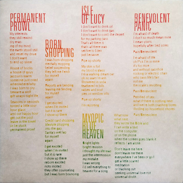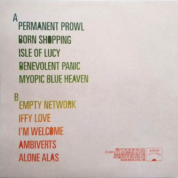 A1. Permanent Prowl 4:00 A2. Born Shopping 2:52 A3. Isle Of Lucy 3:26 A4. Benevolent Panic 2:39 A5. Myopic Blue Heaven 4:39 B1. Empty Network 2:08 B2. Iffy Love 2:50 B3. I'm Welcome 2:41 B4. Ambiverts 3:24 B5. Alone Alas 3:40