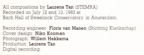 Recorded on July 12 and 13, 1983 at Bach Hall of Sweelinck Conservatory in Amsterdam.