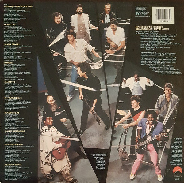 A1. Operator (Thief On The Line) 4:22 A2. Other Love 4:05 A3. Sunset Drivers 4:24 A4. Mandela 4:38 A5. Amaretto 3:36 B1. Rit Variations II 4:15 B2. Be Good To Me 3:50 B3. I'm Not Responsible 4:22 B4. Shadow Dancing 4:25 B5. Heavenly Bodies 4:38
