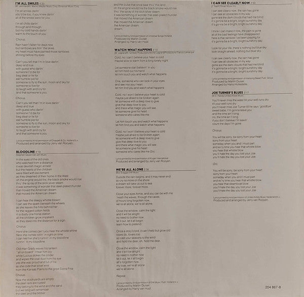 Recorded and mixed at: Wisseloord studio, Hilversum Soundpush studio, Blaricum CTS studio, London Digitally mastered at the Transcription Centre, Baarn ℗ + © 1982 Ariola Benelux Distributed by the Ariola Group of Companies Inner sleeve contains printed lyrics and some versions came with a leaflet for upcoming shows in Holland
