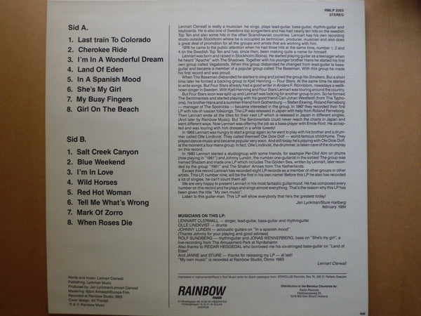 A1. Last Train To Colorado A2. Cherokee Ride A3. I'm In A Wonderful Dream A4. Land Of Eden A5. In A Spanish Mood A6. She's My Girl A7. My Busy Fingers A8. Girl On The Beach B1. Salt Creek Canyon B2. Blue Weekend B3. I'm In Love B4. Wild Horses B5. Red Hot Woman B6. Tell Me What's Wrong B7. Mark Of Zorro B8. When Roses Die