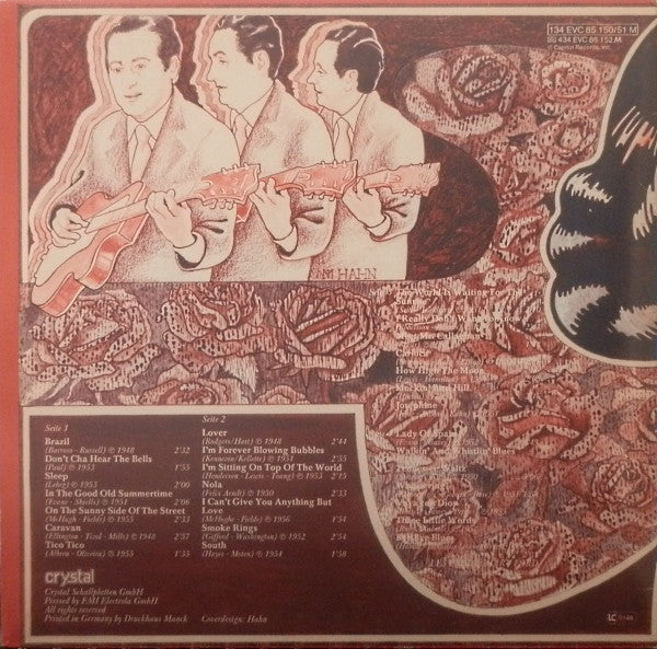 A1. Brazil 2:32 A2. Don't Cha Hear Them Bells 1:55 A3. Sleep 2:00 A4. In The Good Old Summer Time 2:06 A5. On The Sunny Side Of The Street 2:33 A6. Caravan 2:57 A7. Tico Tico 1:35 B1. Lover 2:44 B2. I'm Forever Blowing Bubbles 2:55 B3. I'm Sitting On Top Of The World 2:15 B4. Nola 2:33 B5. I Can't Give You Anything But Love 1:54 B6. Smoke Rings 2:54 B7. South 1:58 C1. The World Is Waiting For The Sunrise 2:10 C2. I Really Don't Want To Know 2:47 C3. Meet Mr. Callaghan 1:48 C4. Carioca 2:29 C5. How High The Moon 2:05 C6. Mockin' Bird Hill 2:16 C7. Josephine 2:00 D1. Lady Of Spain 1:49 D2. Walkin' And Whistlin' Blues 2:40 D3. Tennessee Waltz 3:06 D4. Whispering 1:58 D5. Vaya Con Dios 2:50 D6. Three Little Words 1:54 D7. Bye Bye Blues 2:01