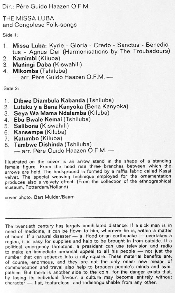 A1. Kyrie A2. Gloria A3. Credo A4. Sanctus A5. Benedictus A6. Agnus Dei . Congolese Folk And Children's Songs A7. Kamimbi (Kiluba) A8. Maningi Daba (Kiswahili) A9. Mikomba (Tshiluba) B1. Dibwe Diambula Kabanda (Tshiluba) B2. Lutuku Y A Bena Kanyoka (Bena Kanyoka) B3. Seya Wa Mama Ndalamba (Kiluba) B4. Ebu Ewale Kemai (Tshiluba) B5. Salibona (Kiswahili) B6. Kansembe (Kiluba) B7. Katumbo (Kiluba) B8. Tambwe Dishinda (Tshiluba)