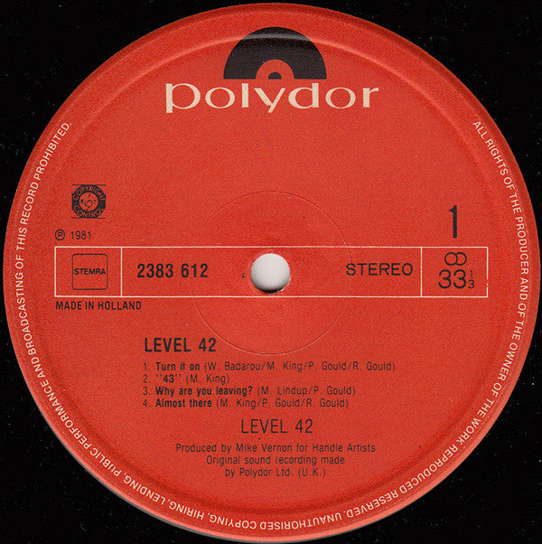 Almost identical to this release except for the position of the LEVEL 42 text on the labels: [r9874019 On Spine: Level 42 Polydor 2383 612 sleeve-info: ℗ 1981 Polydor Ltd. (UK) © 1981 Polydor Ltd. (UK) Printed in Holland Marketed by Polydor B.V. innersleeve-info: Produced for Handle Artists. A Brand New Production. ℗ 1981 Polydor Ltd. U.K. © 1981 Polydor Ltd. U.K. label-info: ℗ 1981 Made in Holland Original sound recording made by Polydor Ltd. (U.K.)
