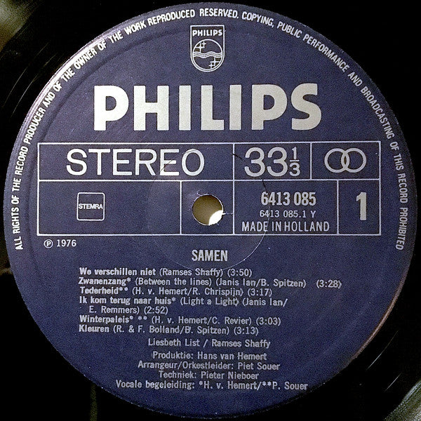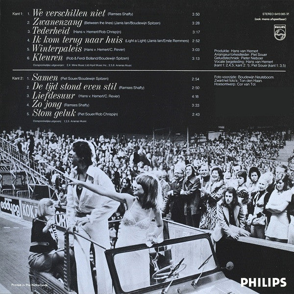 A1. We Verschillen Niet 3:50 A2. Zwanenzang (Between The Lines) 3:28 A3. Tederheid 3:17 A4. Ik Kom Terug Naar Huis (Light A Light) 2:52 A5. Winterpaleis 3:03 A6. Kleuren 3:13 B1. Samen 2:54 B2. De Tijd Stond Even Stil 2:50 B3. Liefdesuur 4:18 B4. Zo Jong 3:33 B5. Stom Geluk 2:43