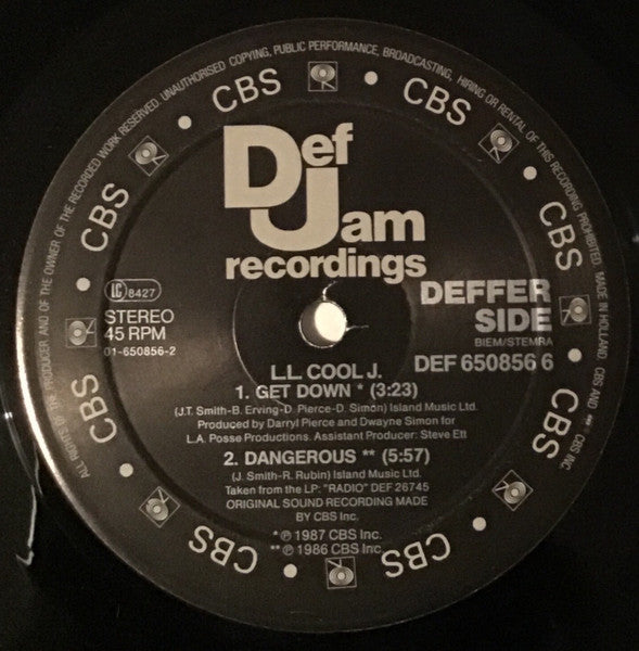 Track durations printed on rear sleeve and centre labels. Track B3, "El Shabazz", isn't credited on release. Tracklisting only contains "Dangerous" with the duration of both tracks (5:57) printed.