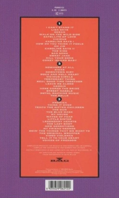 This compilation ℗ 1992 BMG Music Distributed by BMG - A Bertelsmann Music Group Company Printed in Germany Made in Germany Tracks 2.3, 2.8 to 2.10 previously unreleased * Track 2.3 recorded January 1975 * Track 2.8 recorded October 1975 * Track 2.9 recorded live, 1 December 1976 * Track 2.10 recorded live, 21 May 1978 All other tracks previously released: * Tracks 1-1 to 1-3 from 'Lou Reed', 1972 * Tracks 1-4 to 1-6 from 'Transformer', 1973 * Tracks 1-7 to 1-12 from 'Berlin', 1973 * Track 1-13 from 'Rock 'N' Roll Animal', 1974 * Track 1-14 from 'Sally Can't Dance', 1974 * Tracks 1-15, 2-2 from 'Coney Island Baby', 1976 * Track 2-1 is a B-side from 1975 * Tracks 2-4 to 2-6 from 'Rock And Roll Heart', 1976 * Tracks 2-7, 2-11 from 'Street Hassle', 1978 * Track 2-12 from 'Metal Machine Music’, 1975 * Track 2-13 from 'The Bells', 1979 * Tracks 3-1 to 3-3 from 'Growing Up In Public', 1980 * Tracks 3-4 to 3-7 from 'The Blue Mask', 1982 * Track 3-8 from soundtrack 'Get Crazy', 1983 * Tracks 3-9, 3-10 from 'Legendary Hearts', 1983 * Tracks 3-11 to 3-13 from 'New Sensations', 1984 * Tracks 3-14 to 3-16 from 'Mistrial', 1986 * Track 3-17 from v/a 'The Secret Policeman's Third Ball (The Music)', 1987 Total duration: 3:39:54