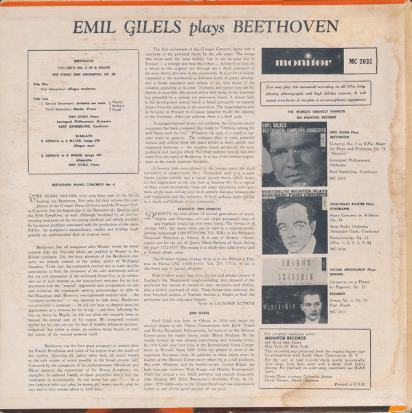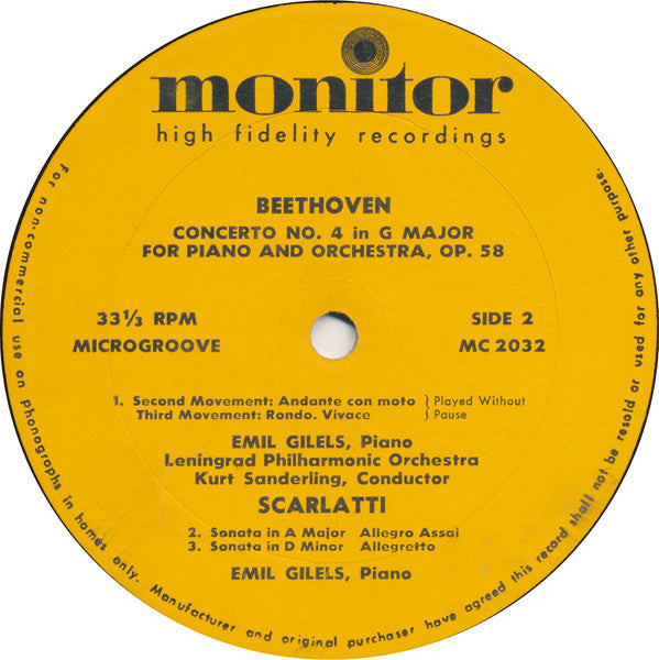 . Beethoven Concerto No. 4 In G Major For Piano And Orchestra, Op. 58 A. First Movement:Allegro Moderato Emil Gilels, Piano . Beethoven Concerto No. 4 In G Major For Piano And Orchestra, Op. 58 B1. 1. Second Movement Andantecon Moto, Third Movement Rondo.Vivace (Play Without Pause) . Scarlatti B2. Sonata In A Major Allegro Assai B3. Sonata In D Minor Allegretto
