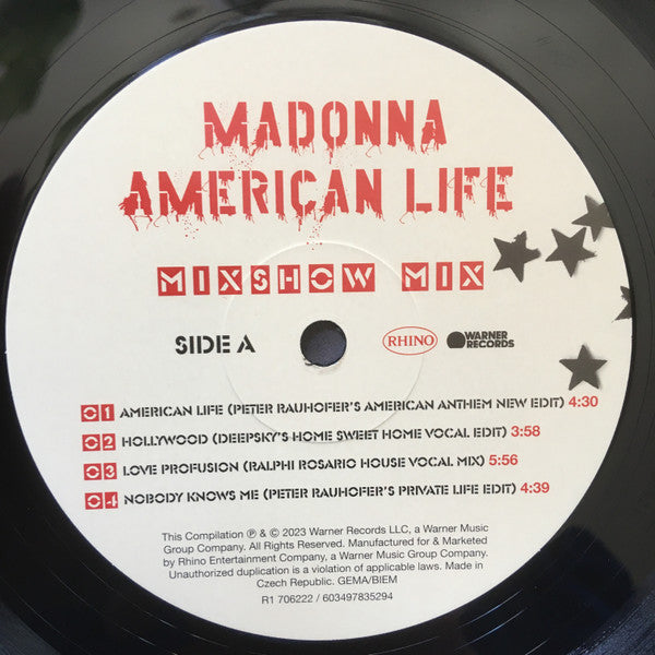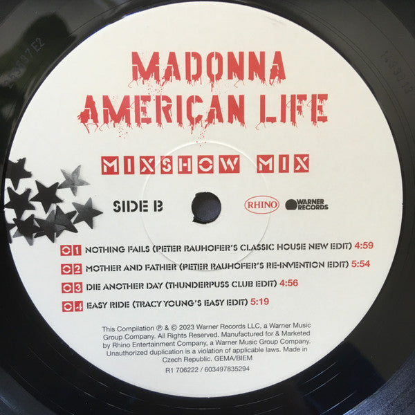 A1. American Life (Peter Rauhofer's American Anthem New Edit) 4:30 A2. Hollywood (Deepsky's Home Sweet Home Vocal Edit) 3:58 A3. Love Profusion (Ralphi Rosario House Vocal Mix) 5:56 A4. Nobody Knows Me (Peter Rauhofer's Private Life Edit) 4:39 B1. Nothing Fails (Peter Rauhofer's Classic House New Edit) 4:59 B2. Mother And Father (Peter Rauhofer's Re-Invention Edit) 5:54 B3. Die Another Day (Thunderpuss Club Edit) 4:56 B4. Easy Ride (Tracy Young's Easy Edit) 5:19