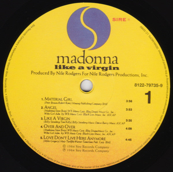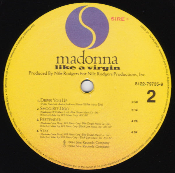 A1. Material Girl 4:04 A2. Angel 3:57 A3. Like A Virgin 3:39 A4. Over And Over 4:13 A5. Love Don't Live Here Anymore 4:51 B1. Dress You Up 4:02 B2. Shoo-Bee-Doo 5:18 B3. Pretender 4:31 B4. Stay 4:09